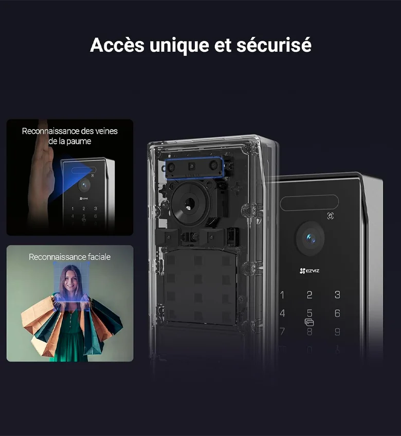 | Méthodes d'ouverture des portes | 1. Déverrouillage par scan veineux de la paume 2. Déverrouillage par reconnaissance faciale 3. Déverrouillage par badge RFID (carte CPU × 3 pièces) 4. Déverrouillage à distance via application 5. Déverrouillage de l'écran intérieur 6. Déverrouillage par mot de passe 7. Déverrouillage par QR code |